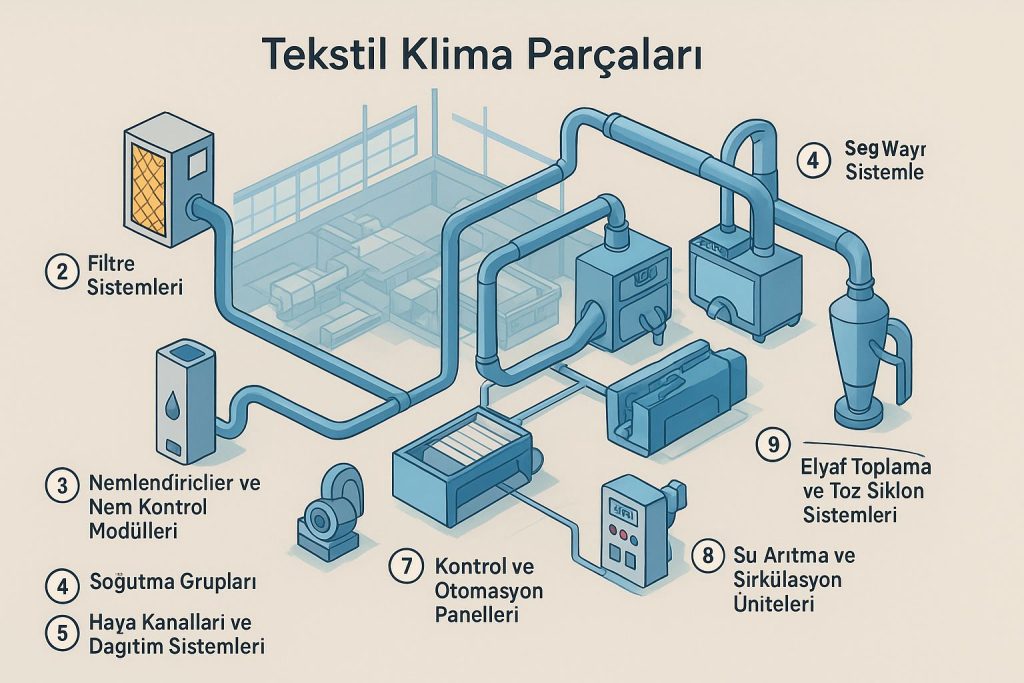 Aşağıda, tekstil klima sistemlerini oluşturan temel bileşenler ve fonksiyonları detaylı şekilde açıklanmıştır.