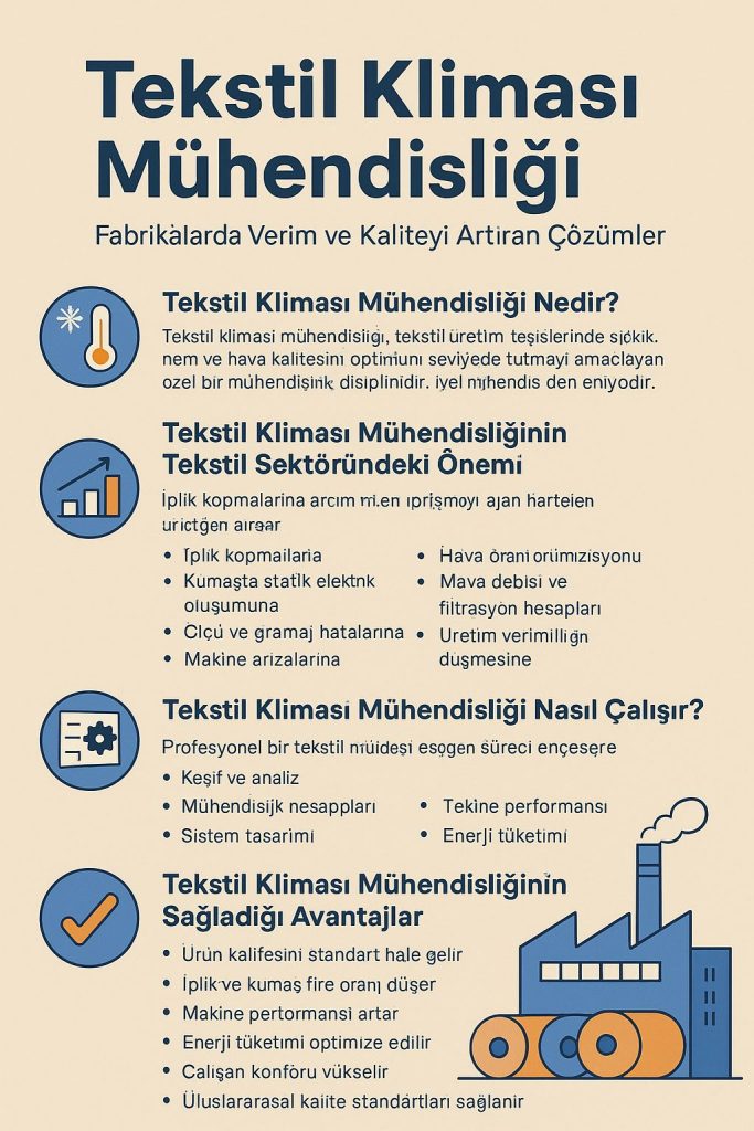 Tekstil kliması mühendisliği, tekstil üretim tesislerinde sıcaklık, nem ve hava kalitesini optimum seviyede tutmayı amaçlayan özel bir mühendislik disiplinidir. İplik, dokuma, örme, boya ve konfeksiyon süreçlerinin her biri farklı iklimlendirme gereksinimlerine sahiptir. Bu nedenle standart klima sistemleri yerine, üretime özel olarak tasarlanan tekstil kliması çözümleri kullanılır.